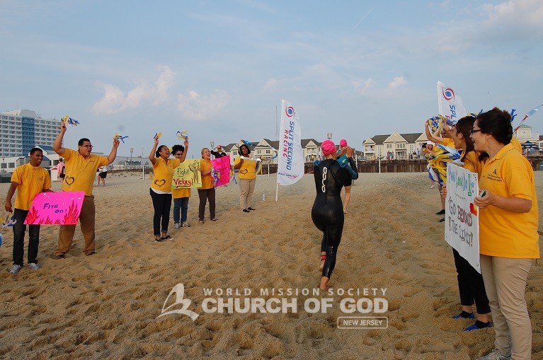 [et_pb_column type=”4_4″][et_pb_text admin_label=”Text”]“Face it, you’re awesome!” was one memorable phrase of the many cheers that Church of God volunteers used to encourage approximately 370 athletes of the 19 years and counting War at the Shore Triathlon on Sunday, July 13.
